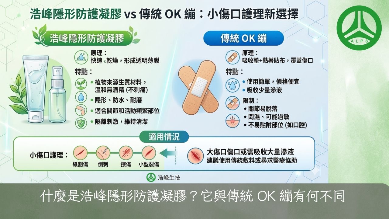 在日常生活中,紙張割傷、倒刺、擦傷或小型裂傷都十分常見。過去多數人習慣使用 OK 繃來保護傷口,但隨著醫療材料技術的進步,一種新的傷口保護方式正逐漸受到重視——浩峰隱形防護凝膠。 浩峰隱形防護凝膠是一種可直接塗抹或噴灑在傷口表面的護理產品,能在皮膚表面形成一層透明的保護膜,幫助隔離外界刺激並維持傷口的清潔環境。與傳統 OK 繃相比,它不需要貼布固定,因此在某些情況下能提供更便利的傷口保護方式。