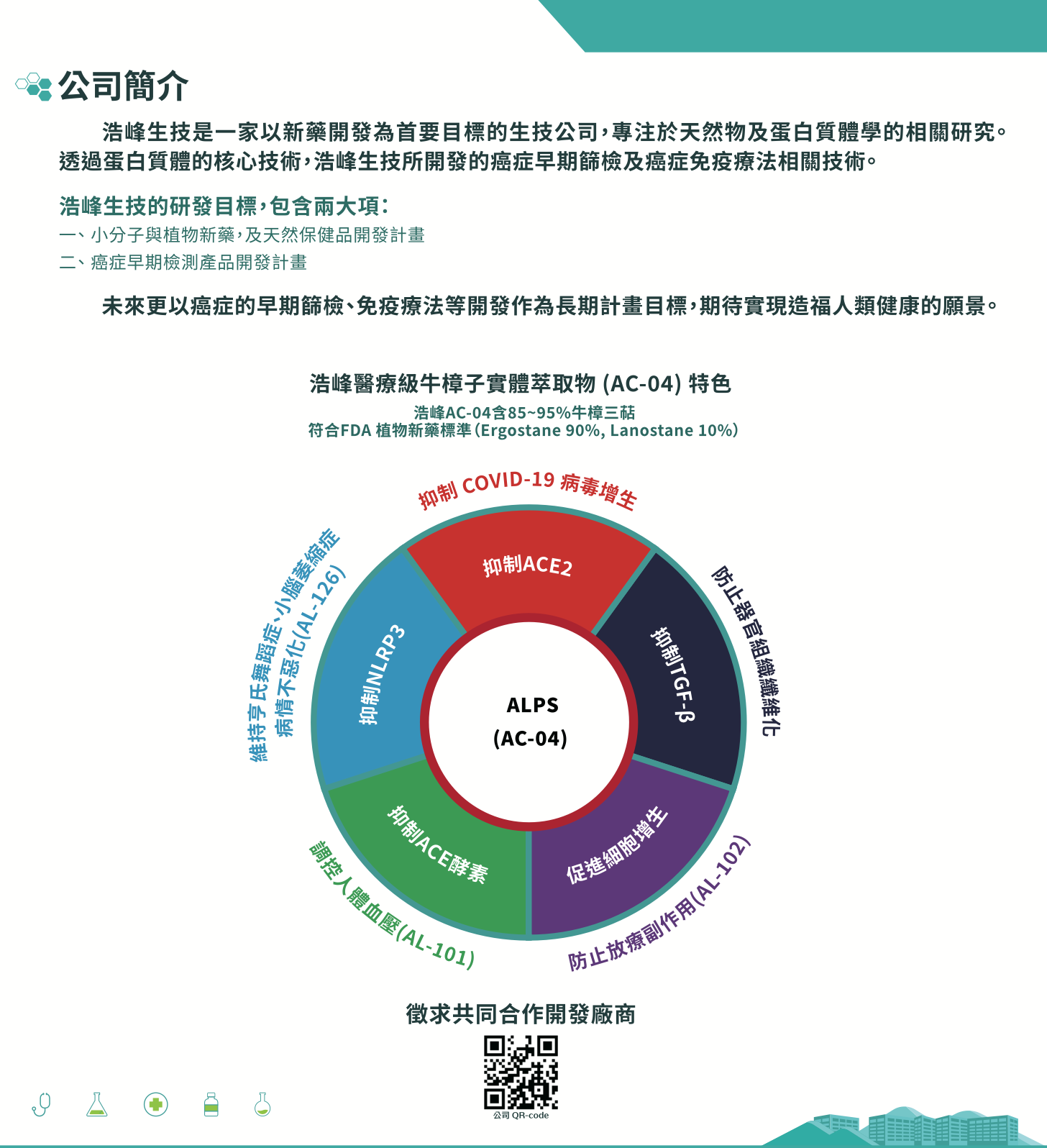 今年的醫療展共設有九大主題、2065個展位,陳水田董事長帶領浩峰生技專業團隊,於精準大健康主題館發表精準檢測及醫療大健康產品等技術,其醫療級牛樟子實體萃取物 (AC-04) 之五大機轉及應用,包括抑制COVID-19病毒增生、防止器官組織纖維化、防止放療副作用、調控人體血壓以及維持亨氏舞蹈症、小腦萎縮症病情不惡化,成果豐碩備受矚目。此次聯展不只於中研院國家生技園區攤位發表公司及產品成果簡報,亦受台灣生技醫療商務生態圈邀請,介紹浩峰生技,獲得高度評價並吸引大批人潮駐足聆聽。