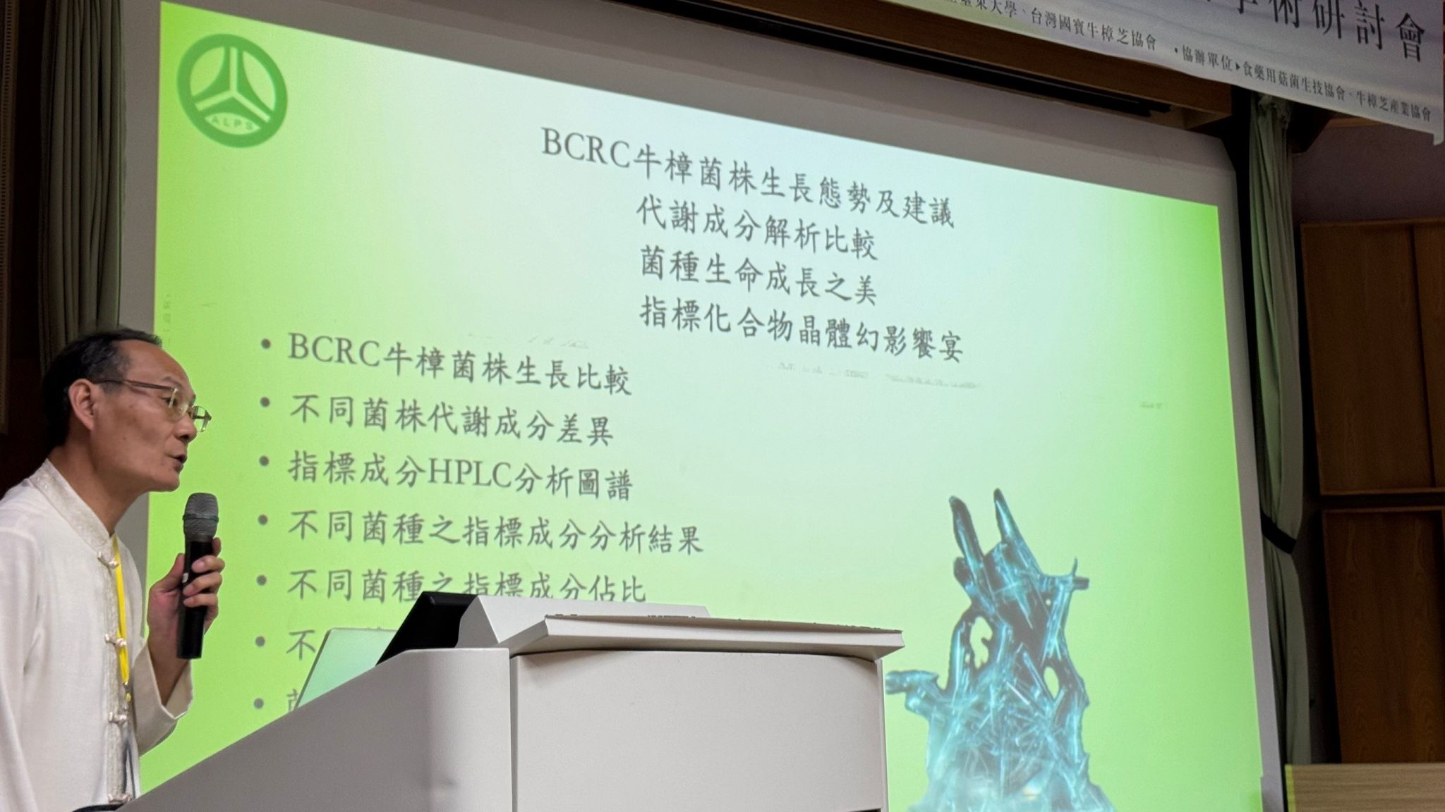 2024年10月25日—浩峰生物科技的人資長葉勝輝先生發表了題為「牛樟芝菌株生長及成分比較,八大指標晶體美學分享」的專題演講,深刻展示了牛樟芝菌株的生長特性和其代謝成分的比較研究,並透過精緻的晶體美學呈現出化學與藝術的結合。