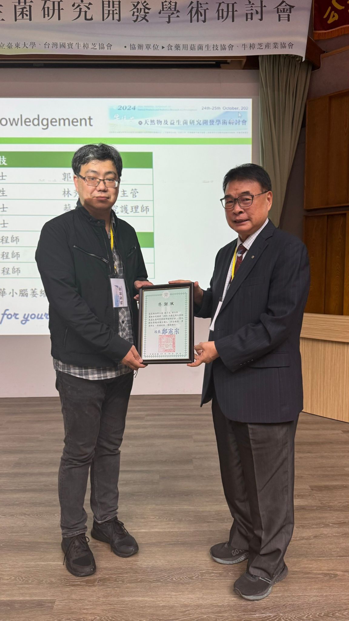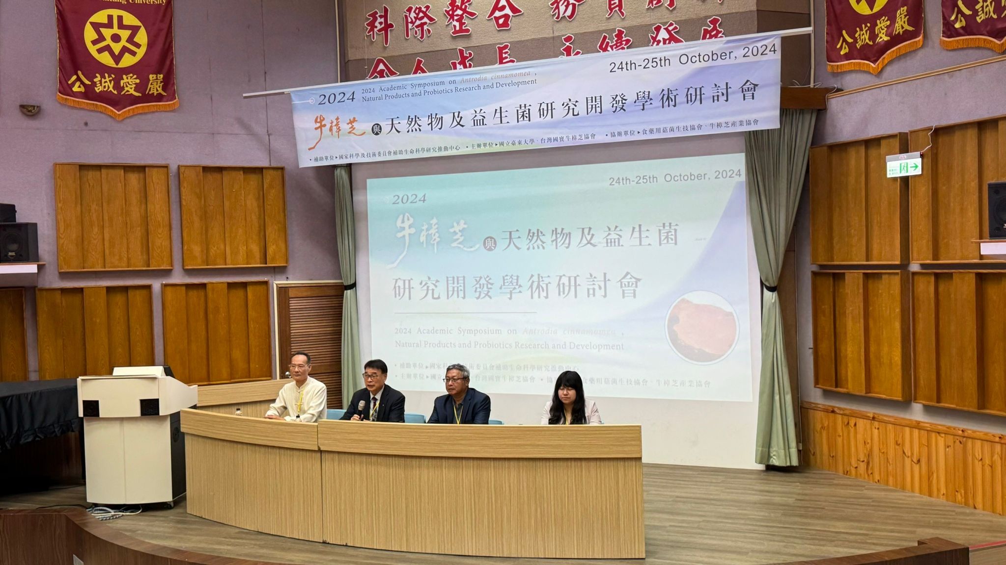 台東,2024年10月24日 — 在本屆2024牛樟芝與天然物及益生菌研究開發學術研討會上,浩峰生技林子文副主任發表了開發牛樟芝植物新藥AC04的最新臨床進展,以「牛樟芝植物新藥AC04的小腦萎縮症服用效果及臨床研究」的演講主題,展示了該新藥在抑制小腦萎縮症方面的潛力和進展,並針對其作用機制、藥物製造與控制方法進行詳細說明。