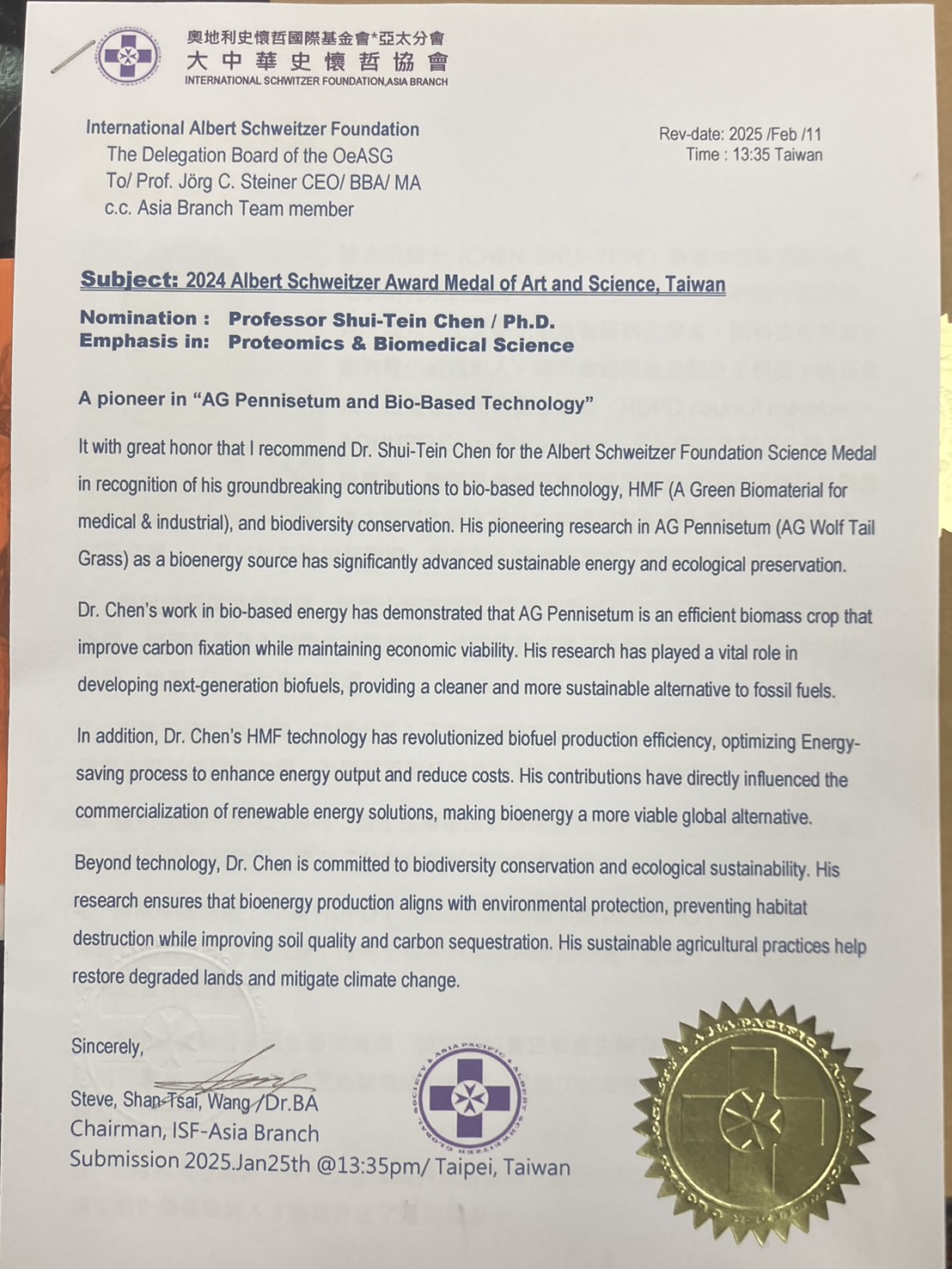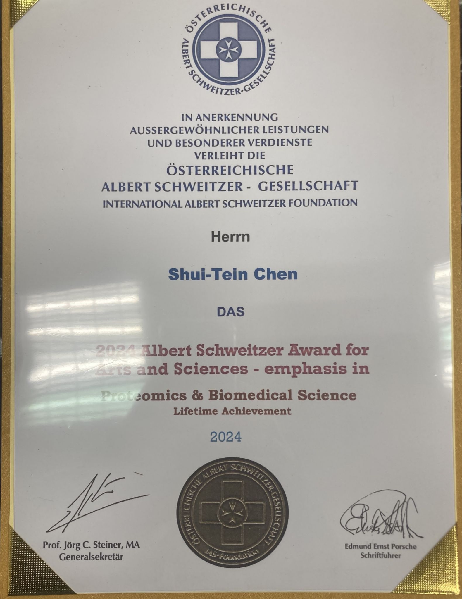 浩峰生技董事長 陳水田博士榮獲 2024 國際史懷哲基金會「藝術與科學獎章」(Albert Schweitzer Award for Arts and Sciences),該獎項特別強調他在 蛋白質體學(Proteomics)與生物醫學科學(Biomedical Science) 領域的傑出成就,並授予 終身成就獎(Lifetime Achievement)。