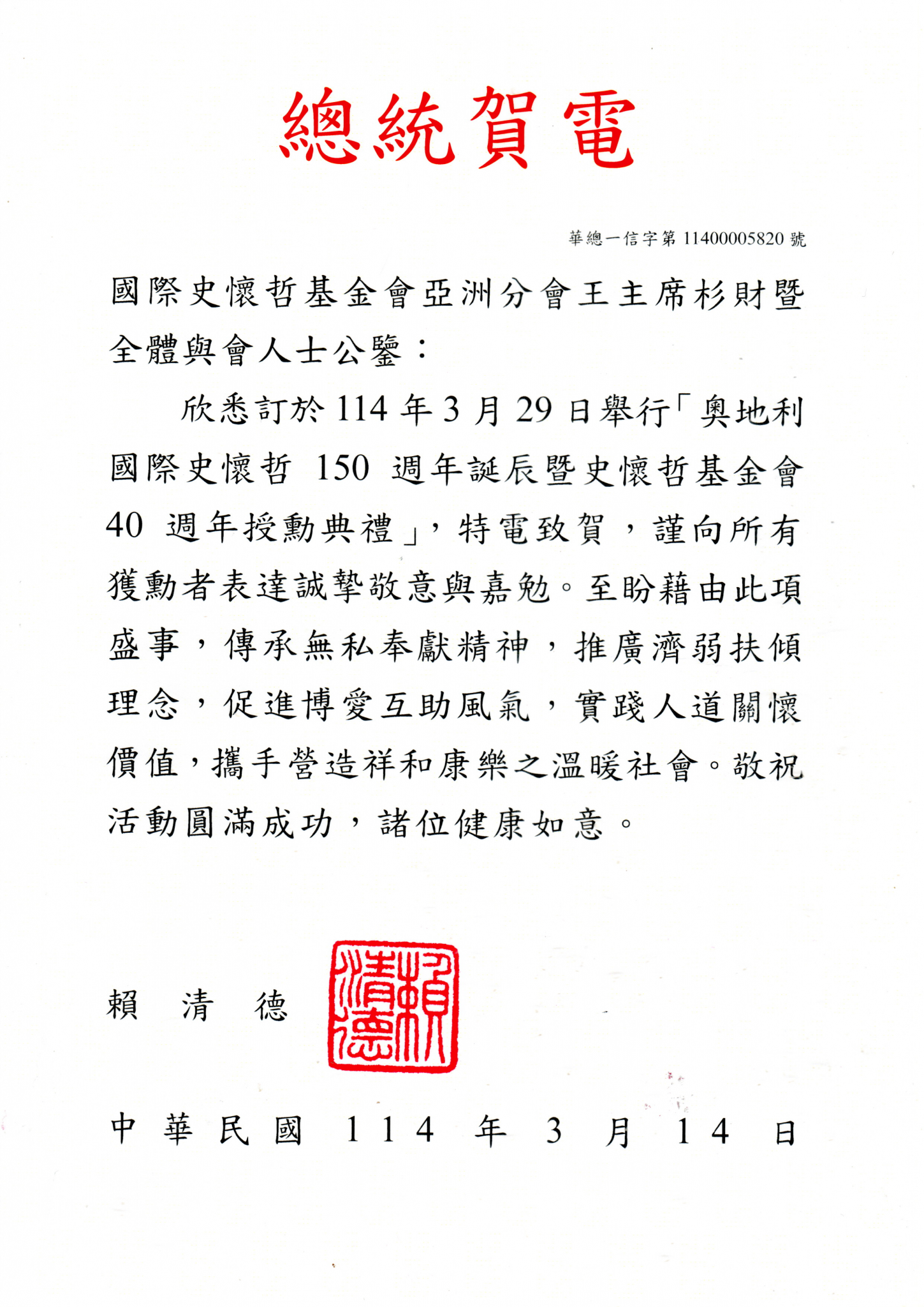 此外,國際史懷哲基金會亞洲分會於 2025 年 3 月 29 日 在台灣高雄舉辦的 史懷哲 150 週年高雄感恩頒獎典禮 上,也特別表彰了陳博士的卓越貢獻。賴清德總統也發來賀電,對所有獲獎者表達敬意與祝賀。